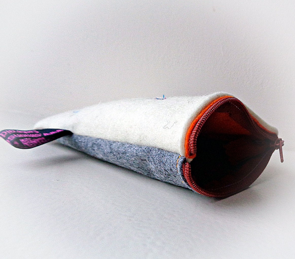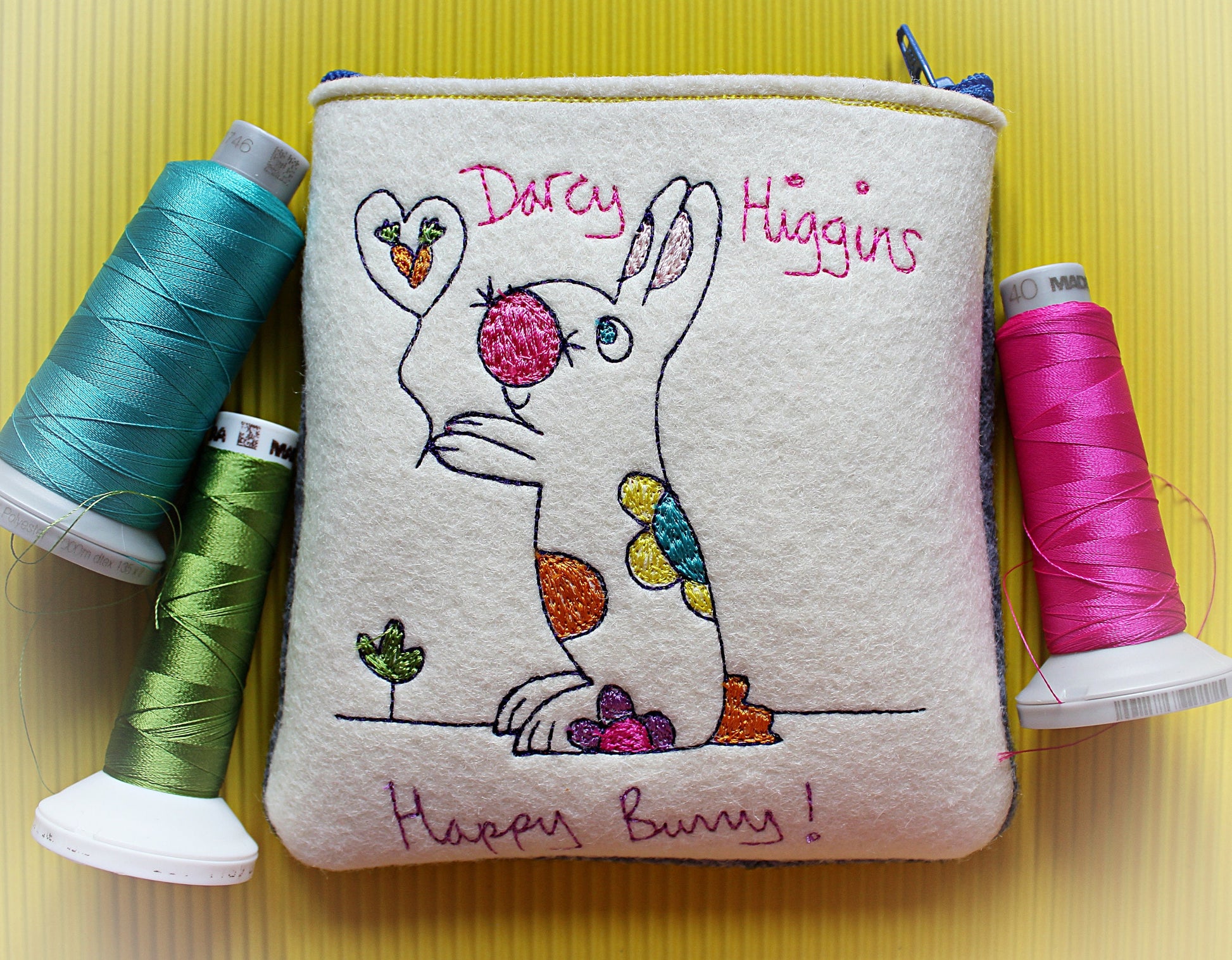 Each bunny rabbit purse is made individually by hand using free-hand machine embroidery. The bunny rabbit design is embroidered onto thick natural wool felt with a zip fastening to the top.